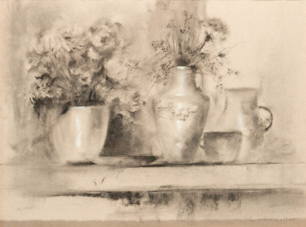 Carmen Laffón, Bodegón con flores, taza y plato sobre una mesa